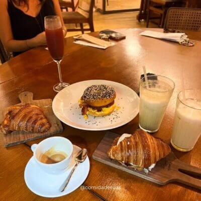 Experimentamos: Em primeiro lugar, para os salgados, nós pedimos: Bacon Bagel (Bagel com gergelim, bacon e ovo mexido – R$ 35,00); Pink Mimosa (Suco de tangerina e espumante – R$38,00); Pão de Queijo com Pastrami (Pão de queijo de tamanho tradicional recheado com pastrami, cebola caramelizada e catupiry – R$ 28,00); Wake me up (Nosso croissant recheado com ovo frito, mussarela e salsa de trufa negra – R$ 36,00); Croque Monsieur (Brioche, bechamel, mussarela, presunto e parmesão gratinado no forno – R$35,00)