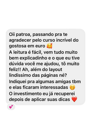Material completo, atualizado e com uma gama de profissionais qualificados que vão te ajudar a enxergar o melhor que existe dentro de você. Você será acolhida em um verdadeiro universo de gostosas apoiando gostosas em todos os sentidos possíveis, todos os dias! Aprovado por centenas de alunas.